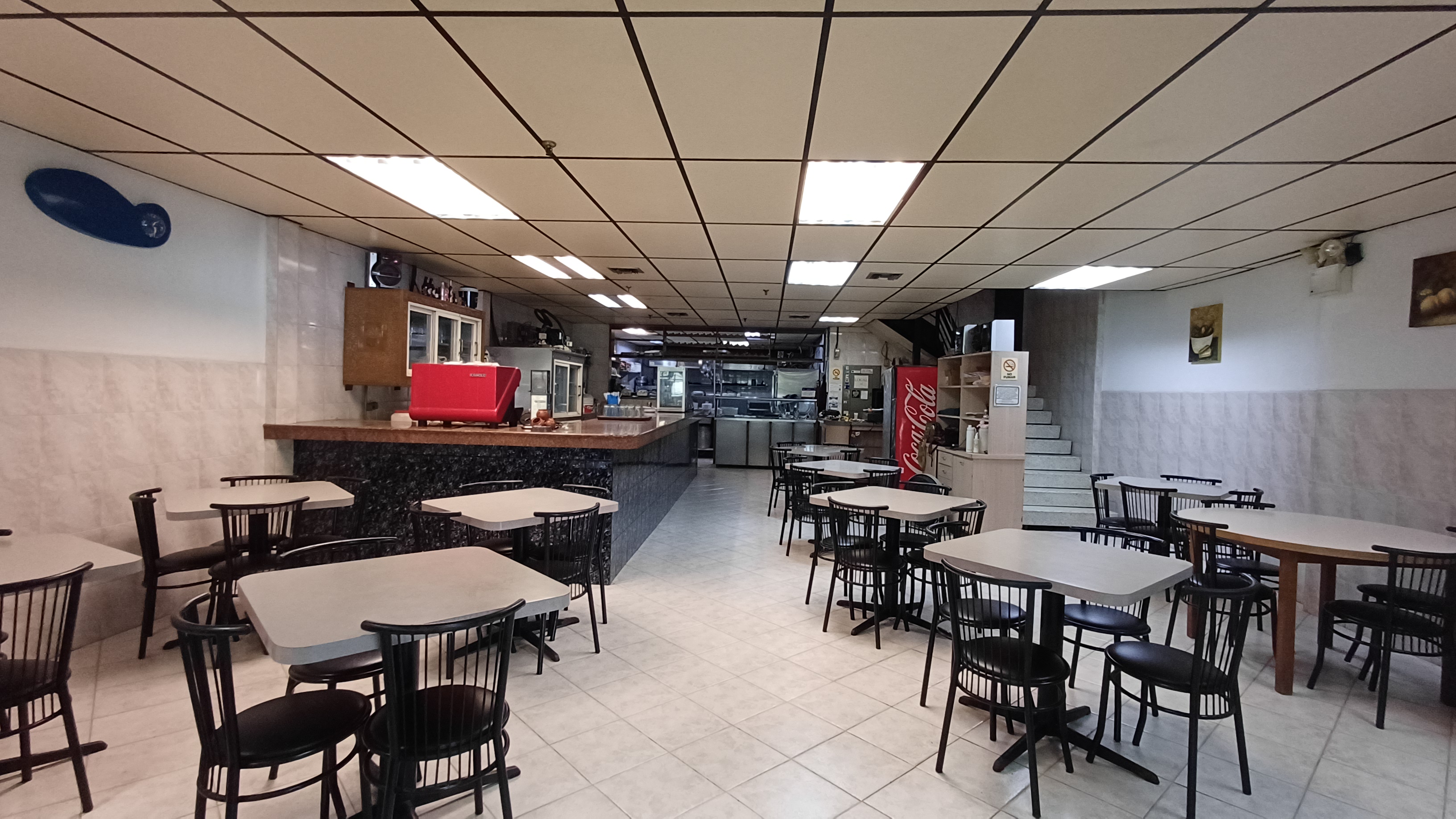 La planta baja cuenta con una cocina completamente equipada, una barra de granito para atención al cliente, mesas y sillas para los comensales, así como un área destinada a la caja registradora y emisión de facturas.